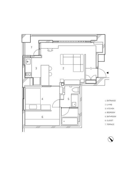 素材と光、多層の時間が交差するこの空間は、日々の暮らしの機微をも受け止める余白を残す。都市の多様な気配に包まれた環境において、暮らしに必要な安らぎを確保することを意識し、静けさと個の美意識を守る居場所としての空間を目指した。